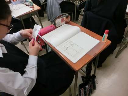 1年生の理科の授業の様子です。単子葉類と双子葉類の葉、茎、根の違いをまとめていました。(遠藤)