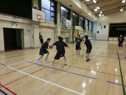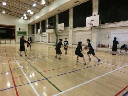 15時から女子バスケットボール部が活動しています。パックラインディフェンスの練習です。ディフェンスは二等辺三角形を意識して動きましょう。(遠藤)