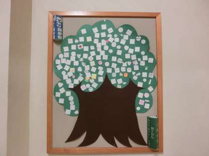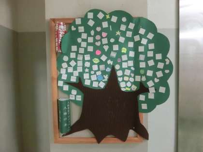 人権の木にたくさんの実がなりました。そのひとつひとつの実に言われて嬉しかった一言が書かれています。この木のように言われて嬉しい言葉で溢れる駒沢中学校になっていくといいですね。(遠藤)