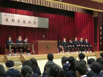 6時間目に後期生徒総会が行われました。前期専門委員長からの活動報告と後期専門委員長から後期の活動計画が伝えられました。駒沢中学校をよりよい学校にしていこうという思いが伝わってくる生徒総会でした。(遠藤)