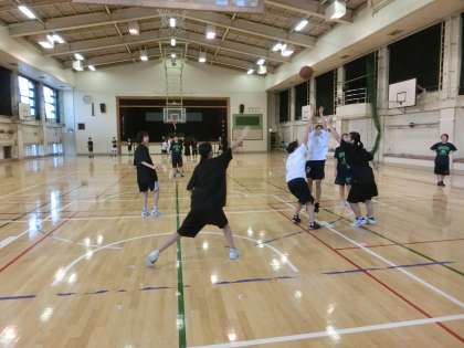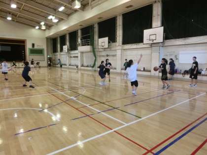 女子バスケットボール部が体育館で活動しています。明日の大庭新海杯に向けて、ディフェンスの練習をしています。クローズアウトやジャンプトゥザボールをしてすばやく動けるようにしましょう。(遠藤)