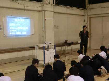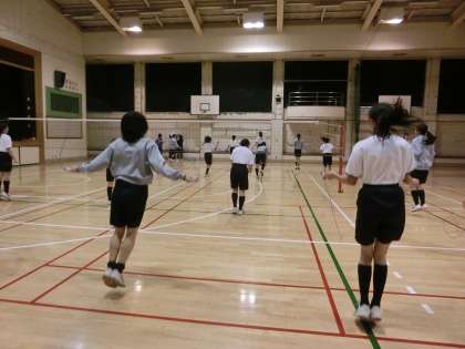 1年生の体育の授業の様子です。男子は保健の授業で「心の発達」について学習していました。女子はバレーボールの前になわとびを使って体力づくりをしていました。(遠藤)