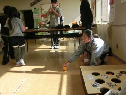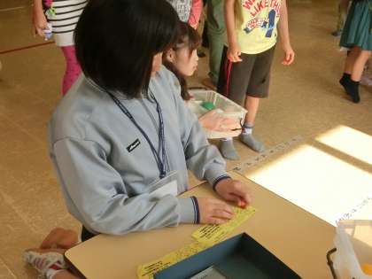 JRC部が弦巻児童館ミステリーハウスに参加しています。遊びコーナーのミステリービンゴのお手伝いをしています。ボールを拾ったり、ビンゴになった子にスタンプをおしてあげたりしていました。(遠藤)