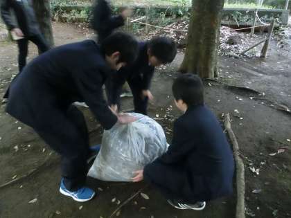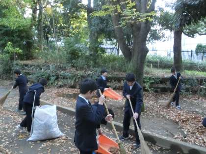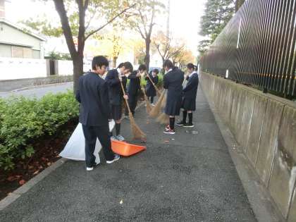 放課後、美化委員会主催の落ち葉はきを行いました。今日は、1年生の担当です。美化委員とJRC部、ボランティアの生徒たちが正門前やタンチ山の落ち葉を掃除しました。おかげでとてもきれいになりました。(遠藤)