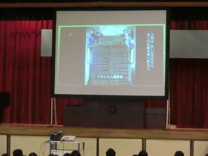 本日、全校朝会を行いました。スライドショーを用いて人権についての学習をしました。先週から、障がい理解授業が行われています。こういった機会を通じて人権についてきちんと考えていきましょう。(遠藤)