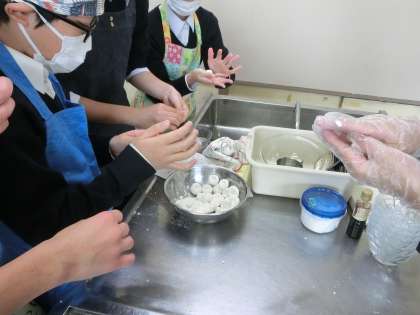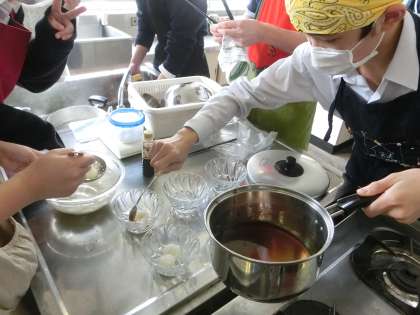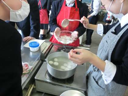 3年生の家庭科の授業の様子です。今日は、調理実習です。白玉あんみつを作っていあました。班ごとに協力して作業を進めていました。(遠藤)