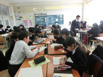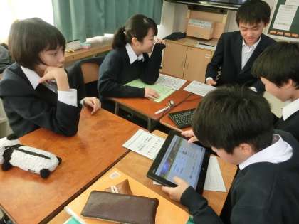 1年生の学活の様子です。校外学習のコース決めをしています。タブレットPCやガイドブックを用いて調べながらコースを考えていました。(遠藤)