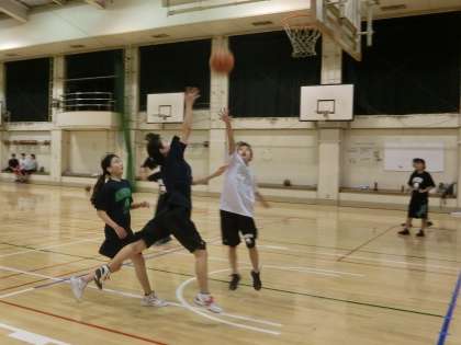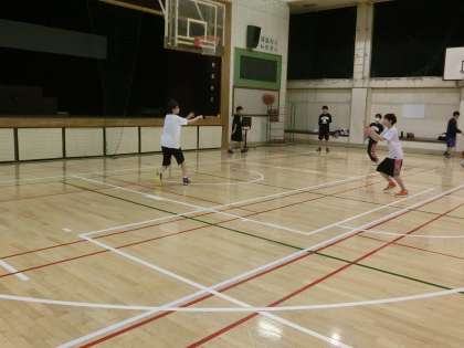 この時間はバスケットボール部が体育館で活動しています。男子は4人のあわせの動きの練習をしていました。女子は2対2で攻守の練習をしていました。(遠藤)