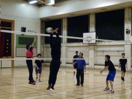 男子バレーボール部が体育館で活動しています。森川先生やコーチも入って試合をしていました。みんな楽しそうです。(遠藤)