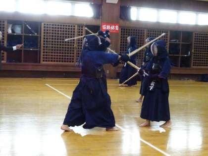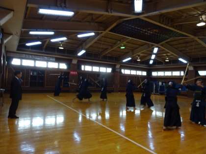 格技室では、副校長先生が見守るなか剣道部が活動していました。前に出ながら面を打つときと、後ろへ下がりながら面を打つときの足の運び方の違いを覚えましょう。(遠藤)
