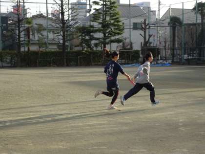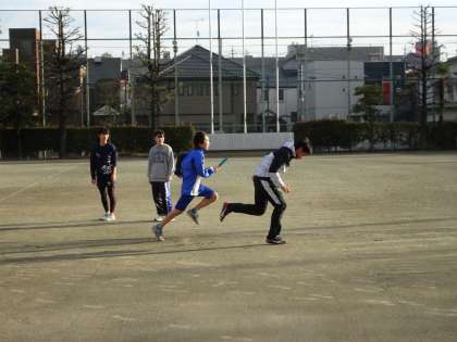 陸上競技部が校庭で活動しています。今日は4人ですが、がんばっています。リレーのバトンパスの練習をしていました。(遠藤)