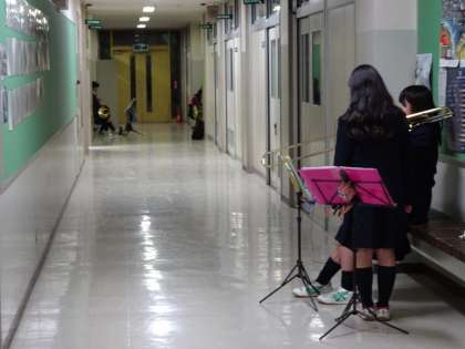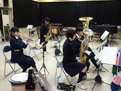 吹奏楽部が第2音楽室で活動していました。パートごとに分かれ、卒業式に向けて練習しています。(遠藤)