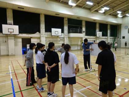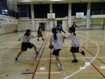 女子バスケットボール部が体育館で活動していました。自分のプレーに合わせて動いたプレーヤーにパスをするのか、自分で仕掛けるのかを瞬時に判断し、ボールを持ちすぎないようにしましょう。(遠藤)