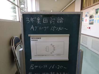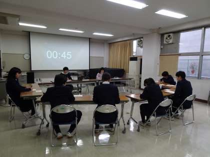 放課後、視聴覚室で3年生が集団討論の練習を行っていました。自分の意見を話すだけでなく、相手の意見をきちんと聞き、それをふまえて話ができるようにしましょう。(遠藤)