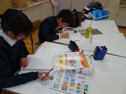 美術室では美術部が活動していました。「子ども虐待防止オレンジリボン運動」の公式ポスターコンテストに応募するためにポスターを描いていました。(遠藤)