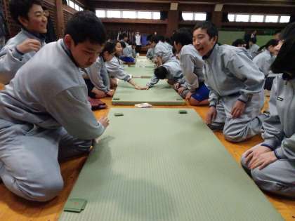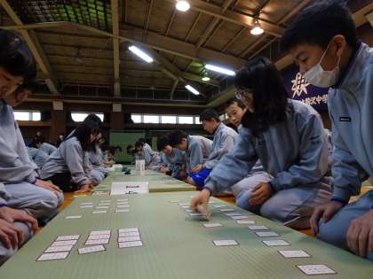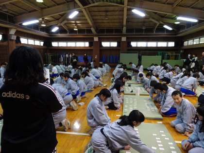 本日3時間目、1年生の百人一首大会を行いました。今日まで国語の授業などで練習してきました。どの畳でも白熱した試合が展開されています。1枚でも多く取れるように集中して読手の声に耳を澄ませていました。(遠藤)