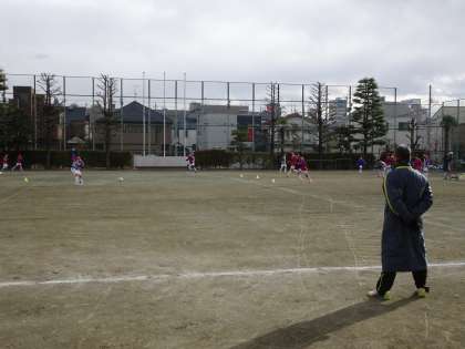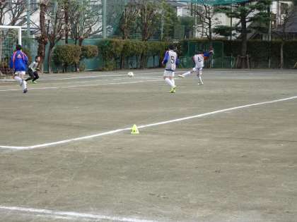 校庭ではサッカー部が活動しています。縦のスペースに走る選手が、スピードを落とさないで次のプレーができるようなパスを出しましょう。(遠藤)