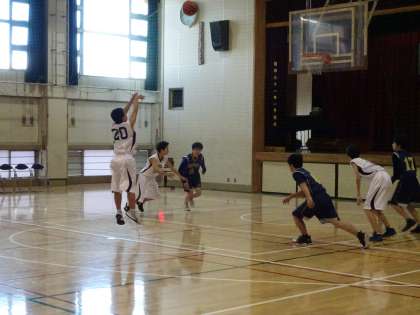 午後から男子バスケットボール部が練習試合を行っています。対戦校は東大和四中です。オフェンスリバウンドを取った後のゴール下シュートを確実に決められるようにしていきましょう。(遠藤)