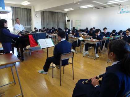 1年生の音楽の授業の様子です。アルトリコーダーのテストを行っています。曲は「エーデルワイス」です。(遠藤)