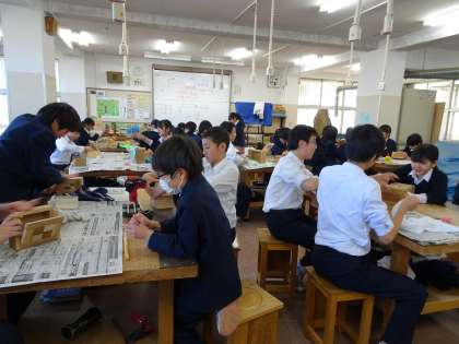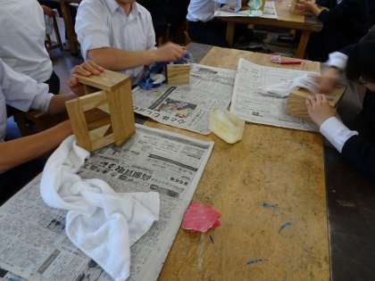 2年生の技術の授業の様子です。作品の仕上げ段階です。紙やすりで磨いたりニスを塗っていたりしていました。(遠藤)