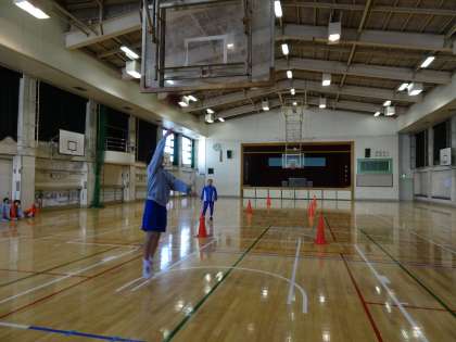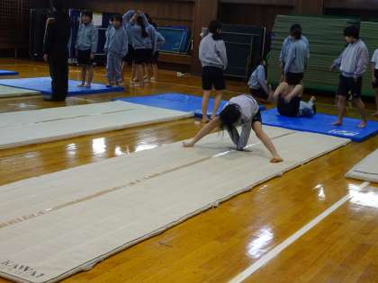 2年生の体育の授業の様子です。男子は体育館でバスケットボール、女子は格技室でマット運動をしています。(遠藤)