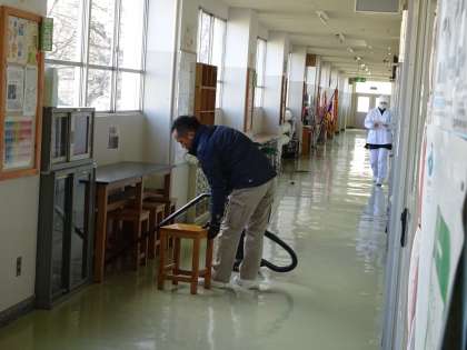 主事さんが校舎の廊下を掃除してくれていました。校舎内がいつもきれいになっているのは主事さんのおかげです。学校生活を支えてくれている人に感謝する心をわすれないようにしましょう。主事さんを見習って、毎日、教室をきれいに掃除しましょう。(遠藤)