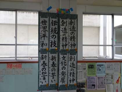 世田谷区立中学校生徒作品展覧会に出展されていた書初めが、校内に掲示されています。どれもすばらしい作品ですね。(遠藤)