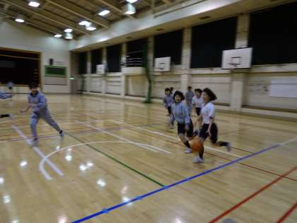 3年生女子の体育の授業の様子です。体育館でバスケットボールをしていました。バスケットボール部は腕の見せ所ですね。(遠藤)