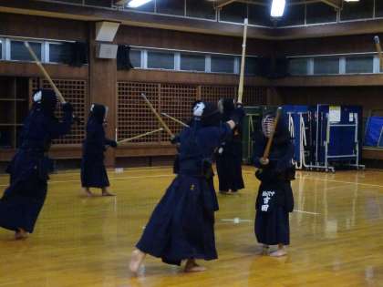 剣道部が格技室で活動しています。面打ちの練習です。打つと同時に右足をつま先をしっかり相手に向けて踏み込みましょう。(遠藤)