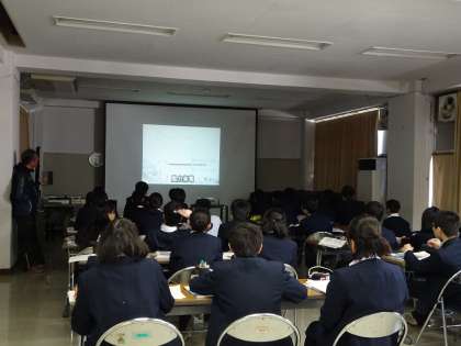 2年生の技術の授業の様子です。視聴覚室で映像を見ながら上手な電気とのつきあい方について学習していました。(遠藤)