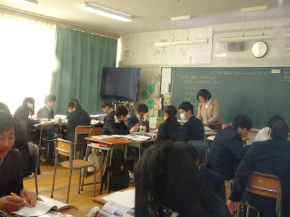 1年生の社会の授業の様子です。今日はグループ学習です。「なぜ難民が生まれるのか」を(モノカルチャー・砂漠化・民族)の3つの言葉をつかって図示しています。(遠藤)