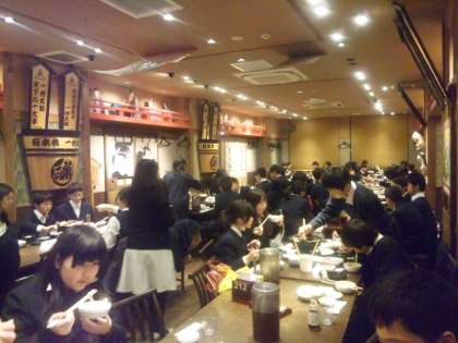 花の舞で昼食タイムです。鶏ちゃんこ鍋を食べています。(遠藤)