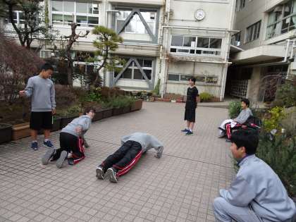 男子バスケットボール部は外練習です。ランニングや筋トレをしていました。(遠藤)