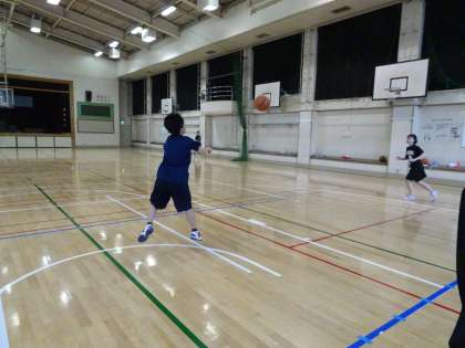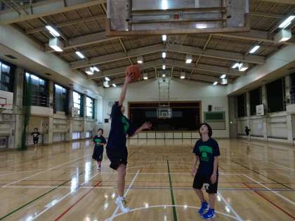体育館では、女子バスケットボール部が活動しています。スリーメンをしていました。シュートを打つ選手がスピードを落とさずにパスキャッチができるように、すばやくリードパスを出しましょう。(遠藤)