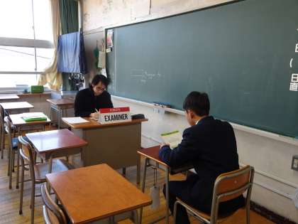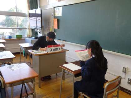 放課後、英語検定2次試験の面接対策をしていました。英語の先生方が面接官になり、本番と同じように練習をしていました。(遠藤)