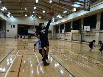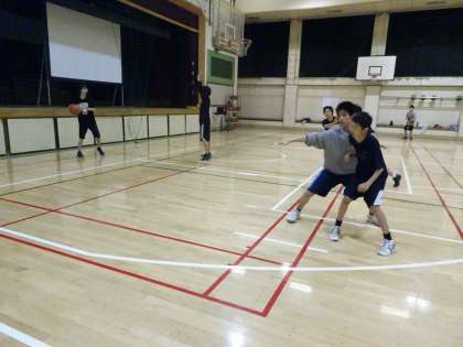 体育館では男子バスケットボール部が活動しています。ディナイの練習をしていました。常に一歩でボールがカットできる位置で相手についてディフェンスをしましょう。(遠藤)