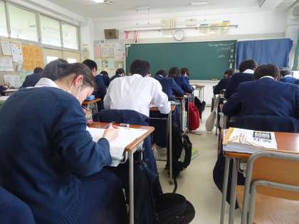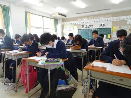 3年生の数学の授業の様子です。明日の都立入試に向けて予想問題を解いています。みんな真剣ですね。明日は、がんばってください。(遠藤)