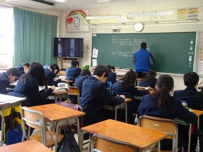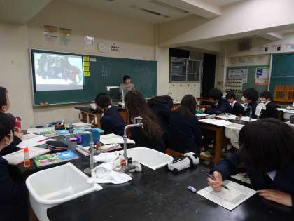1年生の理科の授業の様子です。堆積岩について学習していました。粒の大きさや堆積物の違いなどを区別して覚えましょう。(遠藤)