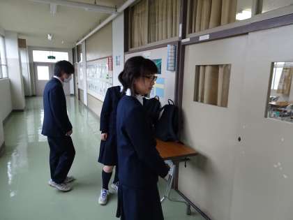 今日は都立一次の合格発表です。発表を見に行った3年生が学校に戻ってきて報告をしています。(遠藤)