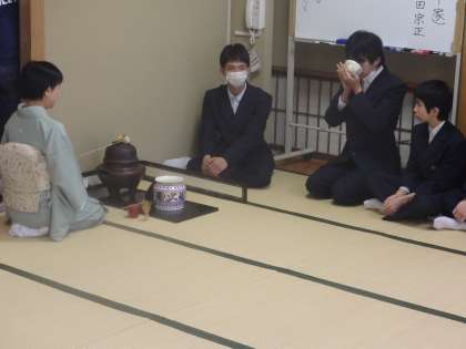 本日、3年生は午前中に各クラスで教科「日本語」の一環として茶道体験授業を行いました。裏千家の先生より茶道の歴史と心得、正しい礼の方法、実際のお点前についてなど充実した授業内容でした。生徒たちも日本の伝統文化について真剣に学んでいました。(田村)