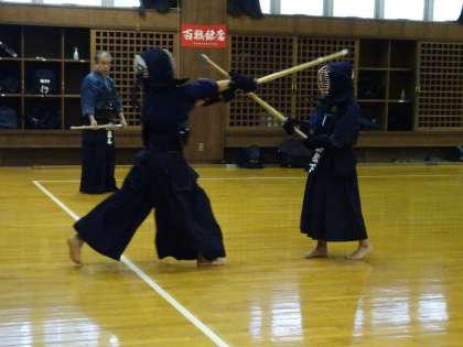 格技室では剣道部が活動しています。面打ちの練習です。(遠藤)