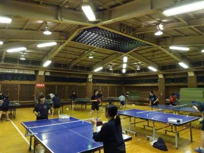 卓球部が格技室で活動しています。サーブ、レシーブの後の3球目に攻撃をしかける練習をしていました。(遠藤)