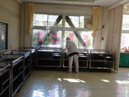 配膳員さんが給食の準備をしてくれています。毎日、おいしい給食を安全に食べられるのは、配膳員さんがきちんと準備してくれているからですね。感謝の気持ちを忘れないようにしましょう。(遠藤)