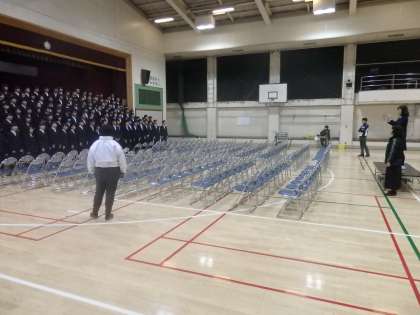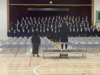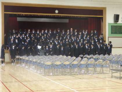 3年生の歌練習の様子です。ひな壇の自分の位置を確認し実際に歌の練習を行いました。さすがは3年生、歌の迫力や気持ちが練習から伝わってきました。この調子で、式本番はさらにすばらしい歌声を体育館に響かせましょう。(田村)