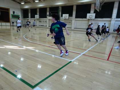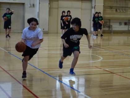 女子バスケットボール部が体育館で活動しています。フットワークはオフェンスでもディフェンスでも基本ですね。一歩目をはやく出せるようにしましょう。(遠藤)