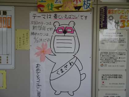 生徒会掲示板のくまざわくんがリニューアルされました。今回のテーマは「春といえばコレ」です。くまざわくんも花粉症のようですね。(遠藤)