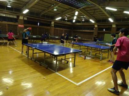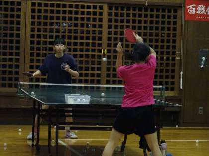 格技室では卓球部が活動しています。ドラ・ブロの練習です。正しいフォームで打てるように意識して練習しましょう。(遠藤)