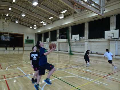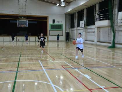 女子バスケットボール部が体育館で活動しています。前を走る人がスピードを落とさずにパスキャッチができるように強いリードパスを出しましょう。(遠藤)