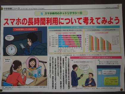 保健室コーナーにこんなポスターが貼ってあります。文部科学省の調査で、スマートフォンを長時間利用している人は「午前中に強い眠気を感じている人が多い」「テストの平均正答率が低い」という結果が出ています。春休みはスマートフォンを長時間利用する機会が増えるかもしれません。適切な利用時間についてもう一度考えてみましょう。(遠藤)