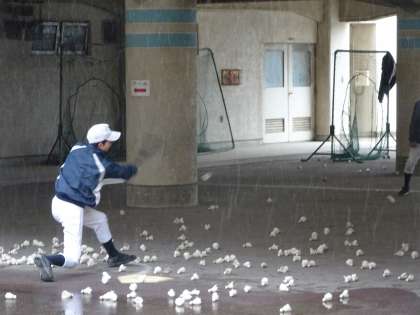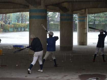 外は雨なので、プール下で野球部が活動しています。素振りをしたりトスバッティングをしたりしています。(遠藤)